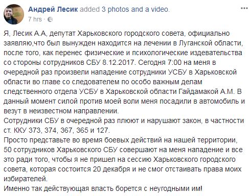 "Я, Лесик А.А, депутат Харьковского городского совета, официально заявляю, что был вынужден находится на лечении в Луганской области после того, как перенес физические и психологические издевательства со стороны сотрудников СБУ 8.12.2017. Сегодня 7:00 на меня в очередной раз произвели нападение сотрудники УСБУ в Харьковской области во главе со следователем по особо важным делам следственного отдела УСБУ в Харьковской области Гайдамакой А.М. В данный момент силой против моей воли меня посадили в автомобиль и везут в неизвестном направлении", - написал он.