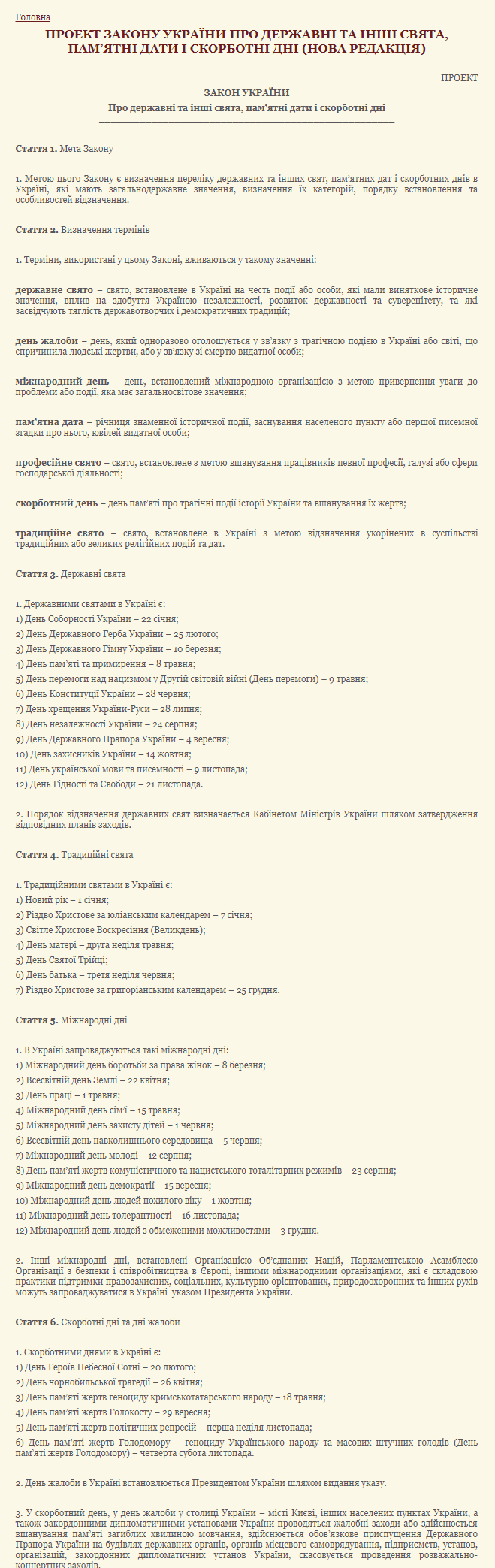 В рамках реформы государственного праздничного календаря Украинский институт национальной памяти хочет систематизировать категории праздников и разделить на государственные, международные праздники, дни траура, памятные даты, профессиональные праздники, скорбные дни, традиционные праздники.