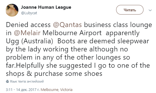 Австралийская авиакомпания Qantas не пропустила в VIP-зал ожидания аэропорта в Мельбурне известную британскую певицу синти-поп группы The Human League Джоанну Кейтрал из-за того, что она была обута в угги. Артистка рассказала об инциденте на своей странице в Twitter.