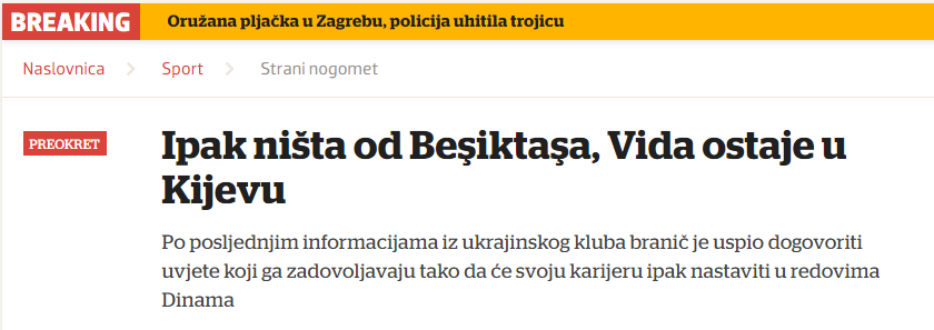 Хорватская газета Vecernji list дала сообщение об этом под рубрикой "Срочные новости".