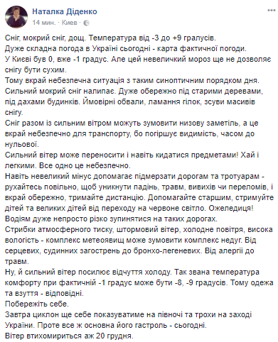 "В Киеве был 0, уже -1 градус. Но этот небольшой мороз еще не позволяет снегу быть сухим. Поэтому крайне опасная ситуация с таким синоптическим порядком дня. Сильный мокрый снег налипает", - сообщает синоптик.