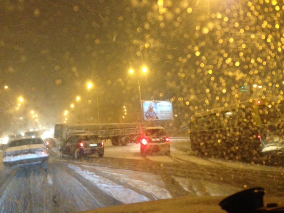 С самого утра в Винницкой, Киевской, Ровенской, Черниговской областях продолжал идти снег. В Киеве к вечеру на дорогах образовались 8-балльные пробки. Практически стоит весь центр.