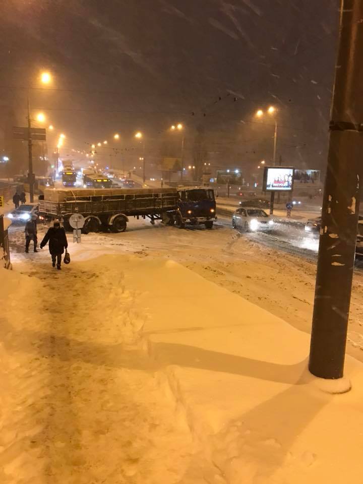 20:00  Воздухофлотский мост в сторону Севастопольской перегородила фура, которую занесло на скользкой дороге.