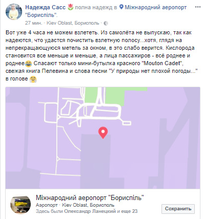 "Из самолета не выпускают, так как надеются, что удастся починить взлетную полосу. Кислорода становится все меньше.. а лица пассажиров - все роднее", - иронизирует журналистка NewsOne, которая находится в салоне.