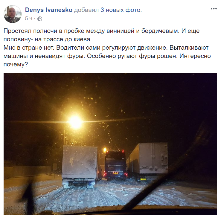 "Простоял полночи в пробке между Винницей и Бердичевым. И еще половину- на трассе до Киева.