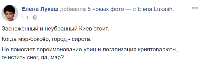 Не помогает переименование улиц и легализация криптовалюты, очистить снег, да, мэр?", - написала в Facebook адвокат Елена Лукаш.