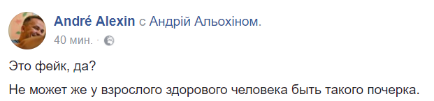 "Это фейк, да? Не может же у взрослого здорового человека быть такого почерка", - написал Алехин в Facebook.