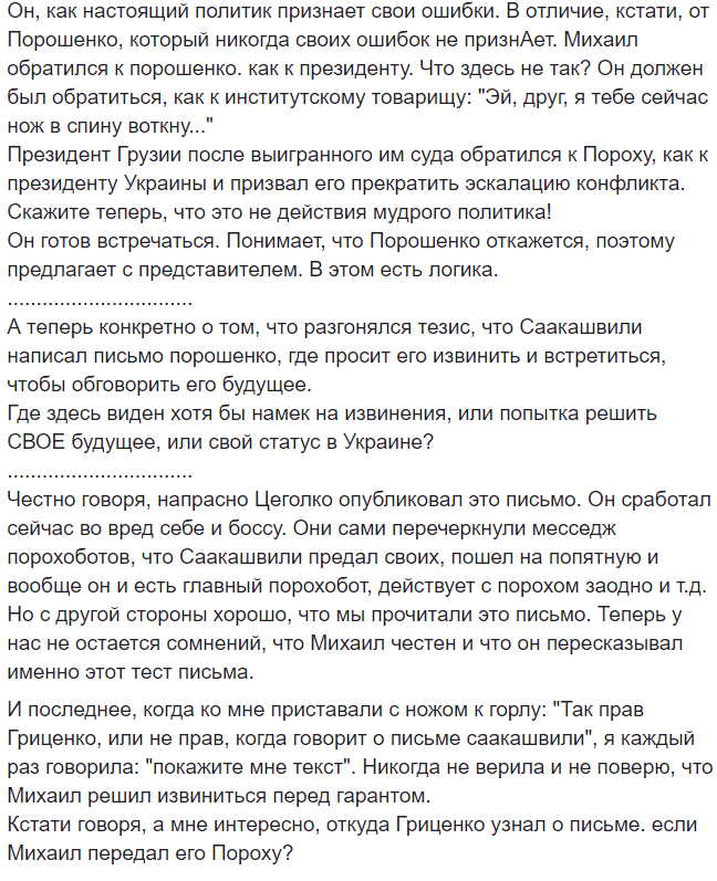 "Михаил слово в слово в последнее время передал его содержание. Он, как настоящий политик признает свои ошибки. В отличие, кстати, от Порошенко, который никогда своих ошибок не признАет. Михаил обратился к порошенко. как к президенту. Что здесь не так? Он должен был обратиться, как к институтскому товарищу: "Эй, друг, я тебе сейчас нож в спину воткну...".