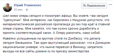 "Навеяно услышанным на круглом столе по Донбассу, что делала сегодня Бекешкина. Там один выступающий рассказал, что в Донецком национально универе, что нынче переехал в Винницу, запретили выходы на все сайты домена ru по приказу министерства", - написал Юрий Романенко.