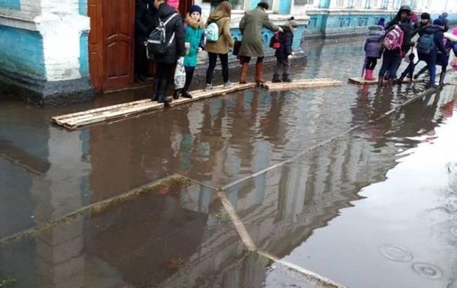 Затопленный вход в школу в городе Ахтырка Сумской области шокировал украинцев. Фотографии, где дети аккуратно идут по дощечкам, опубликовал один из родителей учеников Юрий Павлюк на своей странице в соцсети Facebook.