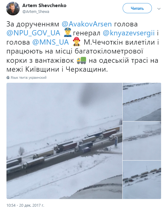 Как сообщает спикер МВД Артем Шевченко, на месте многокилометровой пробки из грузовиков работают спасатели. На место выехал глава МЧС Владислав Чечеткин.