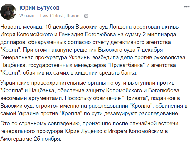 Это по странному совпадению, произошло после случайной встречи генерального прокурора Юрия Луценко с Игорем Коломойским в Амстердаме 25 ноября", - считает Бутусов.