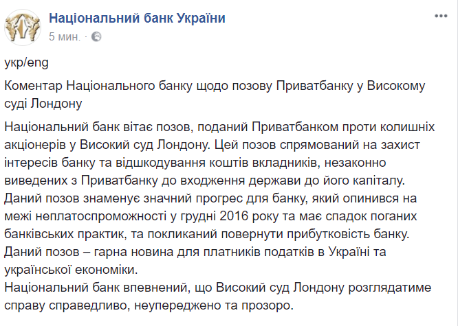 "Национальный банк приветствует иск, поданный ПриватБанком против бывших акционеров в Высокий суд Лондона. Этот иск направлен на защиту интересов банка и возмещения средств вкладчиков, незаконно выведенных из Приватбанка до вхождения государства в его капитал. Данный иск знаменует значительный прогресс для банка, который оказался на грани неплатежеспособности в декабря 2016 года и имеет наследство плохих банковских практик, и призван вернуть прибыльность банка.