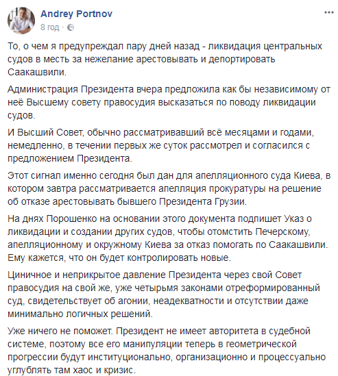 "То, о чем я предупреждал пару дней назад - ликвидация центральных судов в месть за нежелание арестовывать и депортировать Саакашвили.