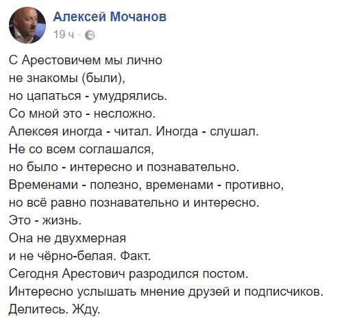"С Арестовичем мы лично не знакомы (были), но цапаться - умудрялись. Со мной это - несложно. Алексея иногда - читал. Иногда - слушал. Не со всем соглашался, но было - интересно и познавательно. Временами - полезно, временами - противно, но всё равно познавательно и интересно.