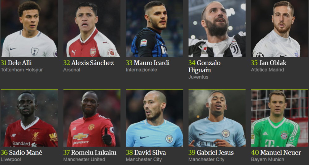 Лионель Месси победил в рейтинге The Guardian в четвертый раз (2012, 2013, 2015, 2017), в то время как Криштиану Роналду признавался лучшим дважды (2014 и 2016 год).