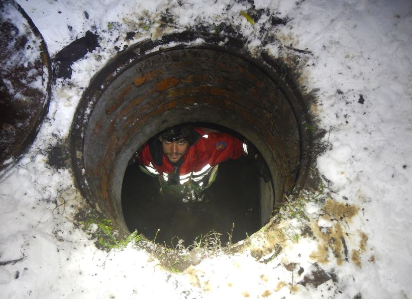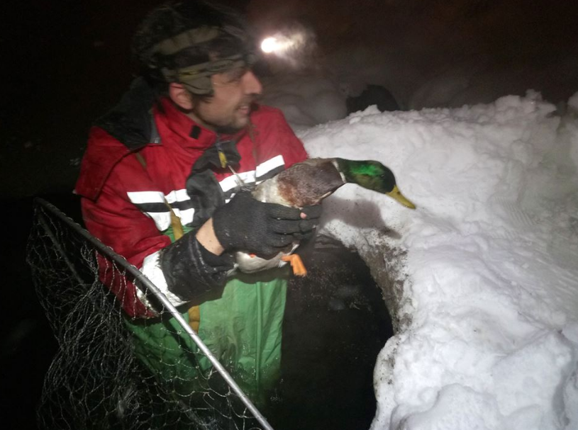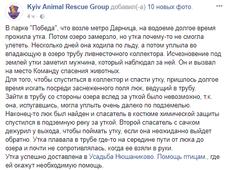 Спасатель в костюме химической защиты спустился в подземную реку за уткой через люк. Второй спасатель с сачком дежурил у выхода, чтобы поймать птицу, если она неожиданно выйдет обратно. Утка плавала в трубе где-то на середине пути от люка до озера и почти не сопротивлялась, когда ее взяли в руки.