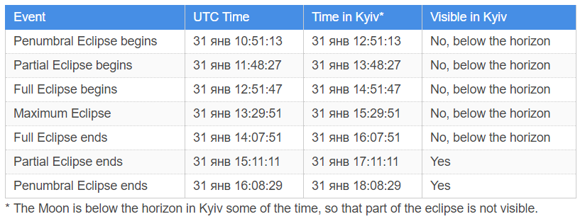 Частичное лунное затмение начнется в 11.48 по Гринвичу, когда в Украине будет 13.48. Полное затмение можно будет наблюдать в 12.51 по Гринвичу или в 14.51 по Киеву. Максимума затмение достигнет в 13.29 (15.29 по Киеву) и закончится в 14.08 (в 16.08 по Киеву). Частичное затмение завершится в 15.11 или в 17.11 по Киеву.