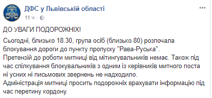 "Около 18:30, группа лиц (около 80) начала блокировку дороги к пункту пропуска "Рава-Русская". Претензий к работе таможни от митингующих нет. Также во время общения людей с одним из руководителей таможенного поста ни устных, ни письменных обращений не поступало", – говорится в сообщении ГФС.