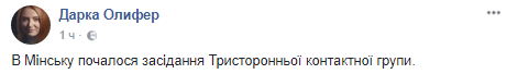 "В Минске началось заседание трехсторонней контактной группы", - написала Дарья Олифер в Facebook.