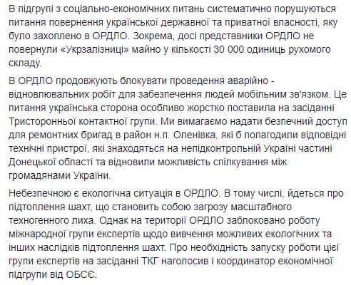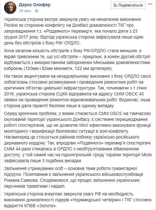 Также Киев заявил о ненадлежащем исполнении Россией как стороной конфликта на Донбассе договоренности о "рождественском перемирии", а сепаратистами из т.н. "ЛДНР" - разминировании и проведению ремонтных работ.