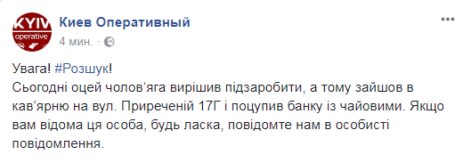 Он зашел в заведение и стащил банку с чаевыми. Если Вам что-нибудь известно о нем, можно поделиться информацией об этом в сообщении facebook-сообществу "КО".