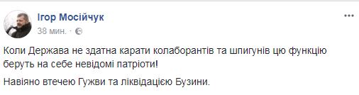 "Да когда же наконец эти прокацпсские уроды не смогут бежать из страны и нести ответственность за свои преступления??? Терпение заканчивается и похоже история Бузины имеет шанс на неоднократное повторение! Когда Государство не способно наказывать коллаборационистов и шпионов эту функцию берут на себя неизвестные патриоты!", - написал он.