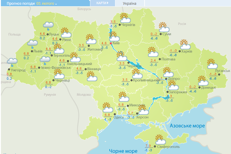 В четверг, 1 февраля, в Украине преимущественно переменная облачность без осадков. Днем плюсовая температура, на севере и востоке небольшой мороз.