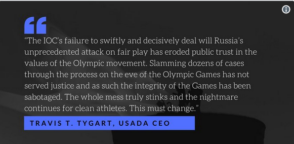 Крайне жестко по поводу решения суда в Лозанне высказался и глава американского антидопингового агентства (USADA) Трэвис Тайгарт. Он назвал "ночным кошмаром" решение CAS оправдать российских спортсменов. Об этом он написал на странице USADA в Twitter.