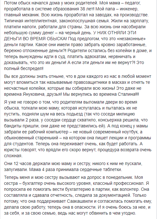 "Они 12 часов держали мою маму и сестру, никого к ним не пускали, запугивали. Мама 4 раза принимала сердечные таблетки", - пишет соратница Саакашвили.