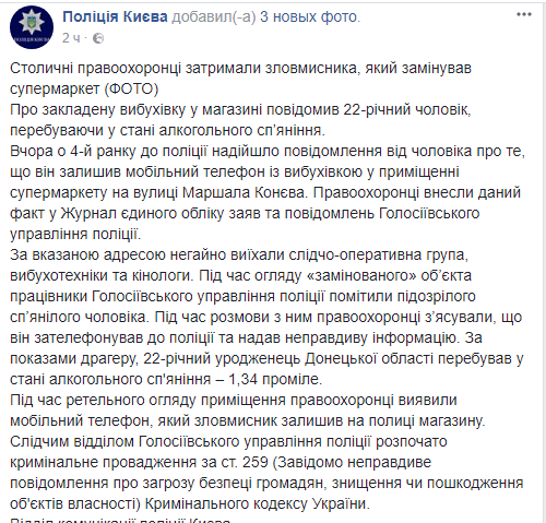 Следственный отдел Голосеевского управления полиции начал уголовное производство по ст. 259 Уголовного кодекса Украины (заведомо ложное сообщение об угрозе безопасности граждан, уничтожения или повреждения объектов собственности).