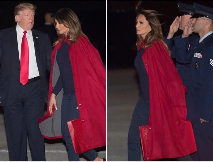 Издание отмечает, что Мелания выбрала образ в патриотических цветах: темно синие скинни-джинсы и вишневый плащ первая леди дополнила парой Лабутенов.