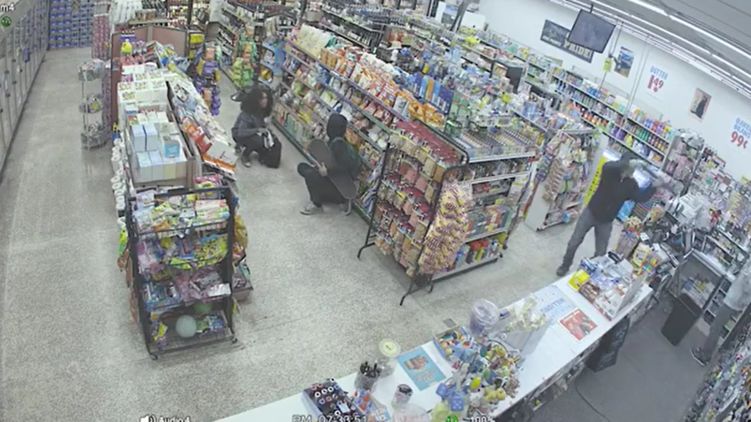 На видео два покупателя пытаются украсть товар, когда в магазин врывается вооруженный грабитель. Двое воришек обезвреживают грабителя, использовав несколько трюков и придавив его стеллажем.