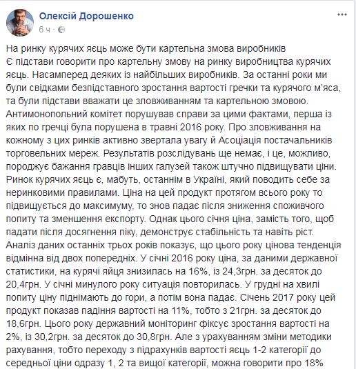При этом Дорошенко заявляет, что с учетом перехода от расчетов цены за 1 и 2 категории к средней цене, можно говорить о 18% роста стоимости за десяток яиц. По этой причине эксперт считает, что должна быть проведена проверка производителей и исследование цены.