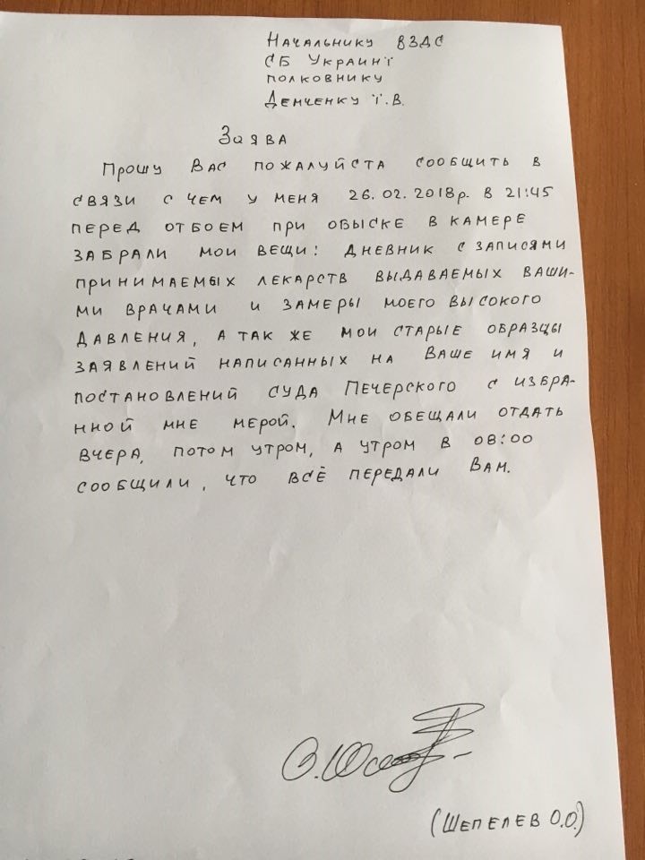 В заявлениях он говорит о том, что не планирует суицид и указывает, что в его смерти нужно будет винить военных прокуроров, СБУ, руководство СИЗО, а также украинского бизнесмена Сергея дядечко. Также он утверждает, что 26 февраля у него в камере состоялся обыск и был изъят его дневник с записями лекарств.