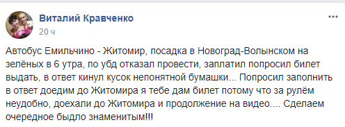 "Автобус Емильчино - Житомир, посадка в Новоград-Волынском на зеленых в 6 утра, по УБД отказал провезти, заплатил, попросил билет выдать, в ответ бросил кусок бумажки непонятной", - рассказывает Кравченко.