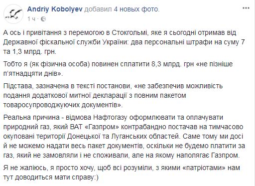 Глава правления "Нафтогаза" Андрей Коболев рассказал, что сегодня, 1 марта, получил от Государственной фискальной службы Украины два персональных штрафа на сумму 7 и 1,3 млрд грн.