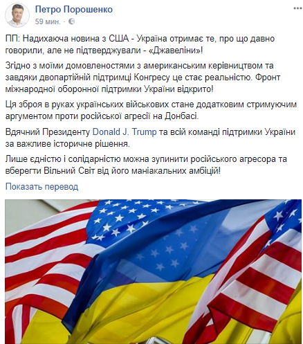 Согласно моим договоренностям с американским руководством и благодаря двухпартийной поддержке Конгресса это становится реальностью. Фронт международной оборонной поддержки Украины открыт. Это оружие в руках украинских военных станет дополнительным сдерживающим аргументом против российской агрессии в Донбассе", - говорится в сообщении.