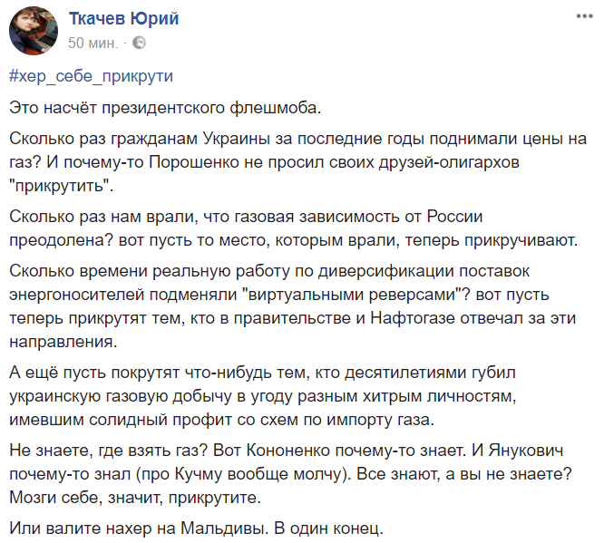 "Сколько раз гражданам Украины за последние годы поднимали цены на газ? И почему-то Порошенко не просил своих друзей-олигархов "прикрутить".