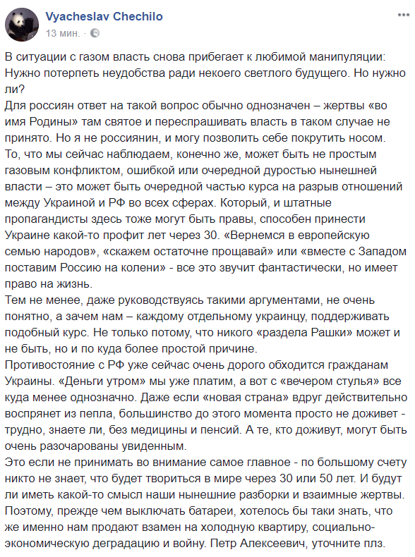 "Все труднее понять наших ура-патриотов. Когда сами себе стреляли в ногу, вводя блокаду Донбасса, запрещая технологичным предприятиям поставлять продукцию в РФ (и почти все они стали), закрывали авиарейсы в Москву, все они кричали: "Нет торговле и любому взаимодействию с агрессором". А как Россия сама отказалась от сотрудничества в газовой сфере – сразу такой вой начался. Радоваться нужно: агрессор принял вашу аргументацию и решил со своим газом идти куда подальше. Сердце ура-патриота должно наполниться радостью. А греть его должна одна только кипучая ненависть к врагам)))".