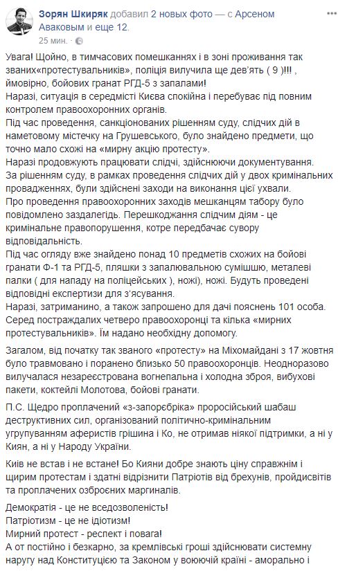 "Во время проведения, санкционированных решением суда, следственных действий в палаточном городке на Грушевского, было найдено предметы, точно мало похожие на "мирную акцию протеста"...При осмотре уже найдено более 10 предметов похожих на боевые гранаты Ф-1 и РГД-5, бутылки с зажигательной смесью, металлические палки (для нападения на полицейских), ножи), ножи. Будут проведены соответствующие экспертизы для выяснения. Для дачи показаний было задержано 101 человек", - пишет Шкиряк.