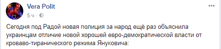 "Сегодня под Радой новая полиция за народ еще раз объяснила украинцам отличие новой хорошей евро-демократической власти от кроваво-тиранического режима Януковича", – прокомментировала она.