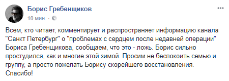 "Всем, кто читает, комментирует и распространяет информацию канала "Санкт Петербург" о "проблемах с сердцем после недавней операции" Бориса Гребенщикова, сообщаем, что это - ложь. Борис сильно простудился, как и многие этой зимой. Просим не беспокоить семью и группу, а просто пожелать Борису скорейшего восстановления. Спасибо!", - говорится в сообщении.