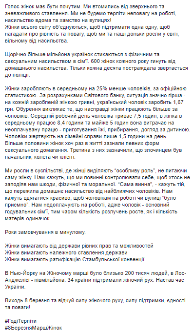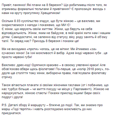 "Голос женщин должен быть услышанным. Мы устали от пренебрежительного и неуважительного отношения. Мы не будем терпеть неуважение на работе, насилие дома и хамство на улицах! Женщины всего мира объединяются, чтобы поддержать друг друга, чтобы напомнить о равенстве и уважении, чтобы мы и наши дочери росли в мире, свободном от насилия", - говорится в анонсе мероприятия.