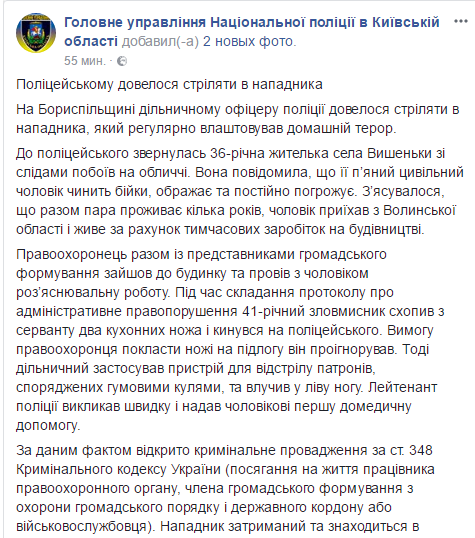Открыто уголовное производство по ст. 348 Уголовного кодекса (посягательство на жизнь сотрудника правоохранительного органа). Нападавший задержан и находится в изоляторе временного содержания, ему объявлено подозрение.