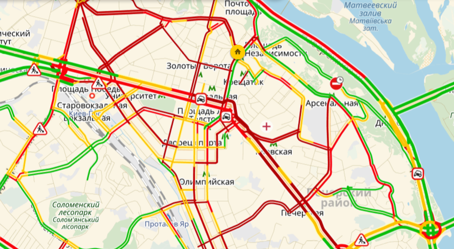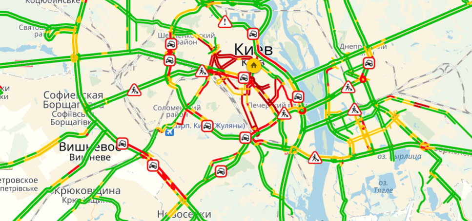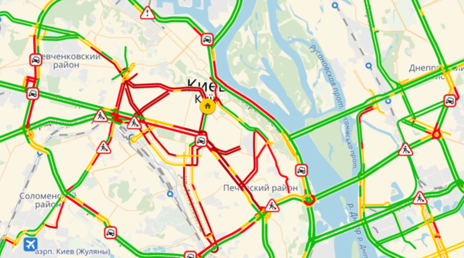 На правом берегу автомобильные заторы образовались по бульвару Шевченко, ул. Владимирской, Крещатику, Пушкинской, Тарасовской, Жилянской, Московской, Коновальца, Сечевых Стрельцов, Бульварно-Кудрявской.