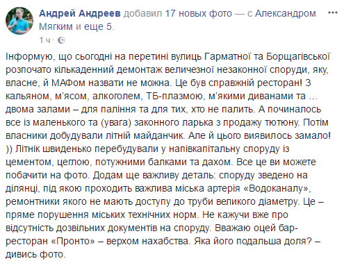 "Это - прямое нарушение городских технических норм. Не говоря уже об отсутствии разрешительных документов на постройку. Считаю этот бар-ресторан верхом наглости», — добавил глава КП "Киевблагоустройство".