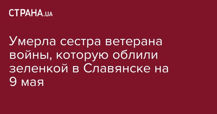 Бабушка, которую облили зелёнкой во время празднования Дня Победы в Славянске, жива. Это "Стране" подтвердила волонтер Лилия Рудич, которая посещает семью ветерана Любови Печко, которая пострадала от действий радикалов в Славянске в День Победы. Ранее ряд СМИ сообщили, что Любовь Печко умерла на следующий день после инцидента.