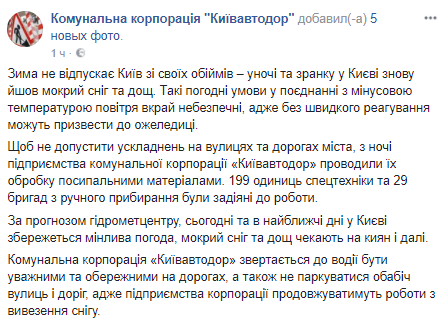 "Чтобы не допустить осложнений на улицах и дорогах города, с ночи предприятия коммунальной корпорации "Киевавтодор" проводили их обработку посыпочными материалами. 199 единиц спецтехники и 29 бригад по ручной уборке были задействованы в работе", - говорится в сообщении.
