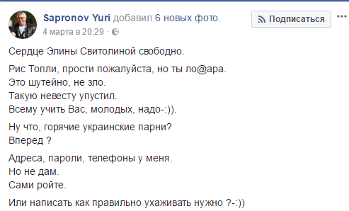 "Сердце Элины Свитолиной свободно. Рис Топли, прости пожалуйста, но ты ло@ара. Это шутейно, не зло. Такую невесту упустил. Всему учить Вас, молодых, надо-:))", - написал Сапронов.